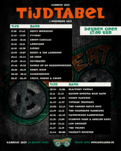 Er spelen 23(!) bands tijdens Karbeat 2025. Kom op tijd en mis niks. De entree is open vanaf 17.00 uur en de muziek is van 17.30 – 00.00 uur. Zie de afbeelding voor het blokkenschema.