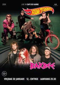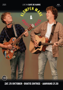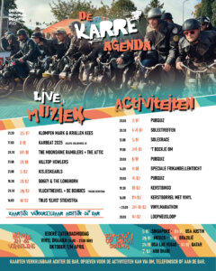 Er spelen 23(!) bands tijdens Karbeat 2025. Kom op tijd en mis niks. De entree is open vanaf 17.00 uur en de muziek is van 17.30 – 00.00 uur. Zie de afbeelding voor het blokkenschema.